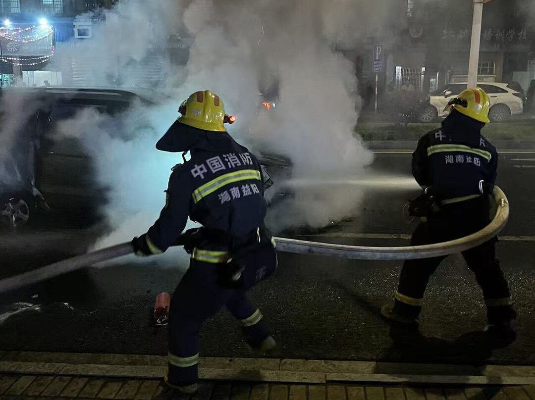 沅江市凌云塔政府專職消防救援站正在對沅江市嘉禾社區(qū)1組石磯湖修理廠旁道路上自燃的面包車進(jìn)行撲救