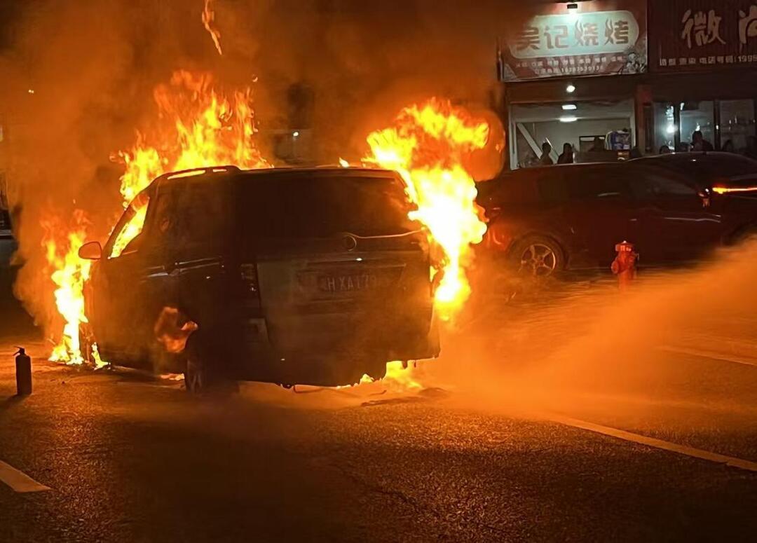 沅江市嘉禾社區(qū)1組石磯湖修理廠旁道路上正在猛烈燃燒的面包車明火已撲滅