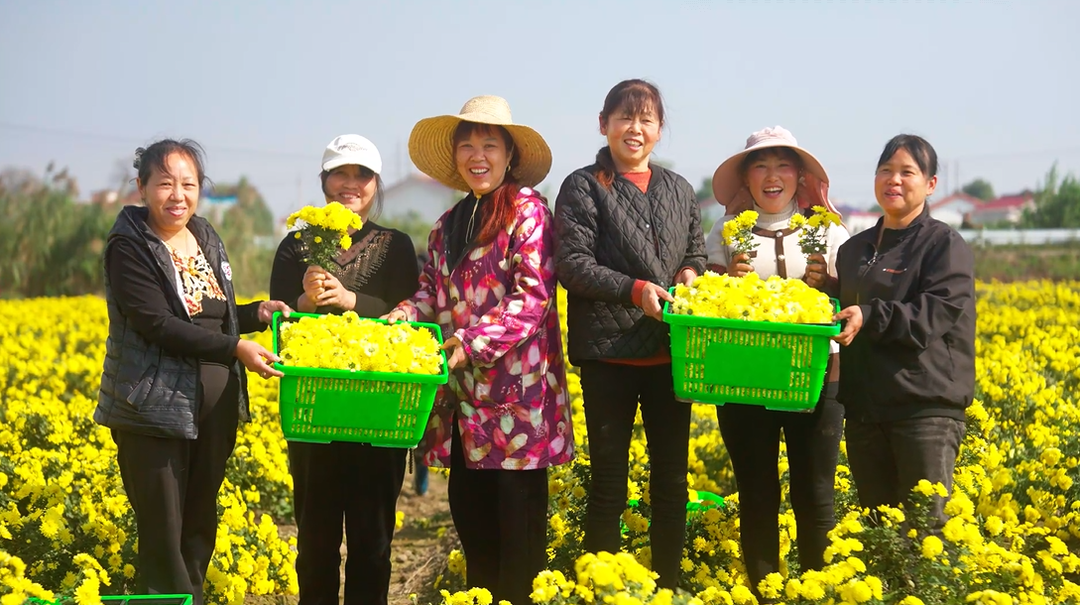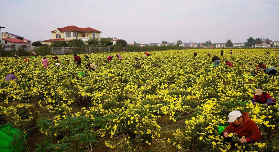 湊近聞能感受到清甜中帶著溫潤的香氣。“自從村里種了皇菊,我在家門口就能日均掙120元,還能照顧老人孩子。這菊花不光好看,泡著喝清熱明目,曬干了做香包、入藥都管用,城里人格外喜歡!”田間地頭里,60余名村民分散忙碌,黨員志愿者們帶頭示范采摘技巧,“大拇指輕按花蕊,捏住花蒂巧用力,別碰掉花瓣才值錢”的口訣在花海中傳遞,一筐筐金黃的皇菊很快整齊碼放,等待運往加工廠房。