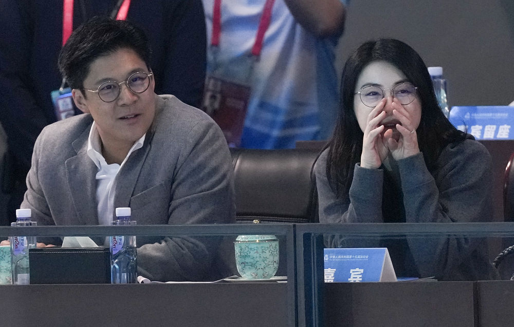 11月13日,郭晶晶(右)和霍啟剛在場邊觀賽。新華社記者 薛宇舸 攝