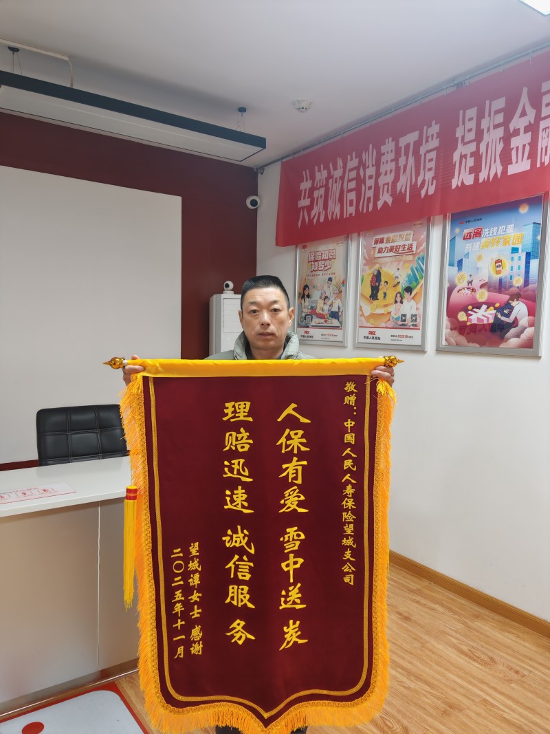 2025年11月6日,客戶譚女士將一面印有“人保有愛 雪中送炭 理賠迅速 誠信服務(wù)”的錦旗送至人保壽險(xiǎn)望城支公司,特別點(diǎn)贊了公司“手機(jī)理賠、兩小時(shí)到賬”的高效服務(wù)。